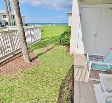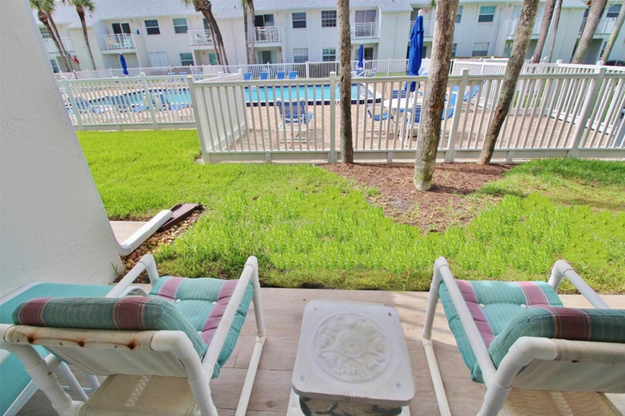 Before you set up your towel and umbrella on the shore, take the time to enjoy your fully furnished, ground-floor patio. This area has modern wood-tile flooring, two cushioned chairs, and a lounger for afternoon naps in the Florida sunshine. As it looks directly onto the complex's pool, you'll find yourself unable to stay here long as you'll frequently be going for swims!