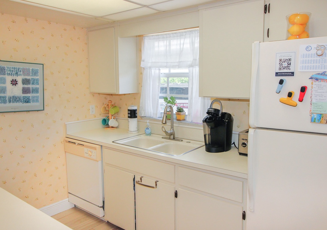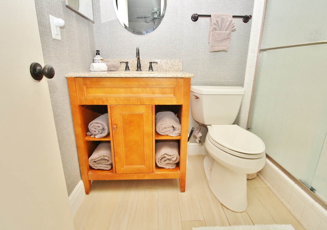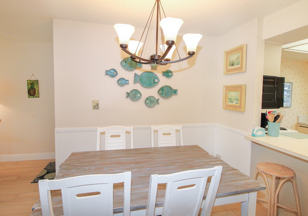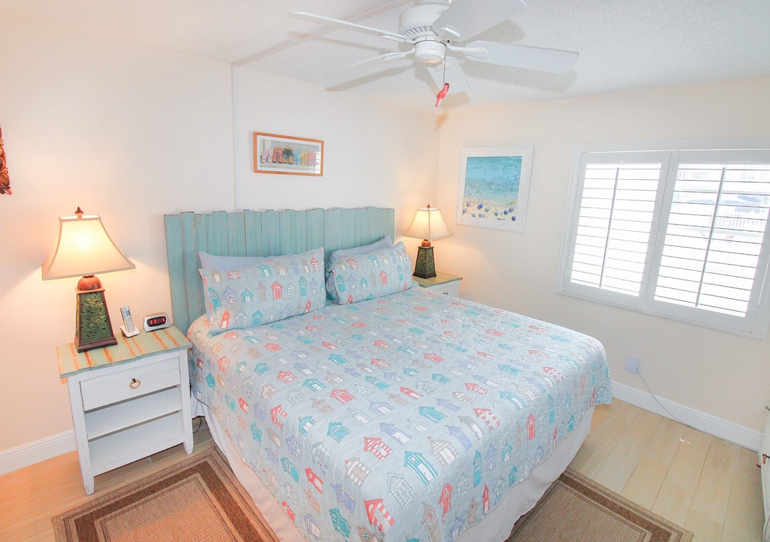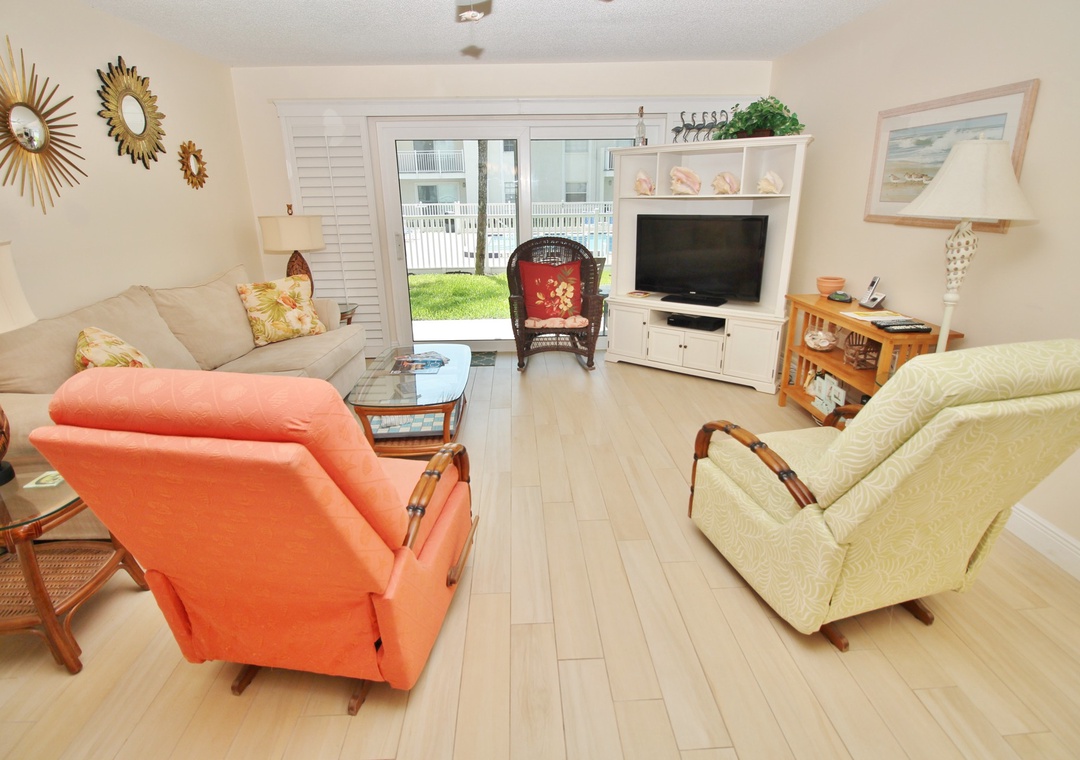 Inside, the condo features a spacious layout designed for both relaxation and togetherness. The primary bedroom offers a king bed and a private ensuite bathroom, while the guest bedroom includes two twin beds – perfect for families or friends. The living room’s sleeper sofa provides extra sleeping space for guests, and the coastal-inspired décor creates a warm and welcoming atmosphere. Just under 10 minutes from famous Flagler Avenue, this condo combines comfort, convenience, and unbeatable beach access for your next New Smyrna getaway.