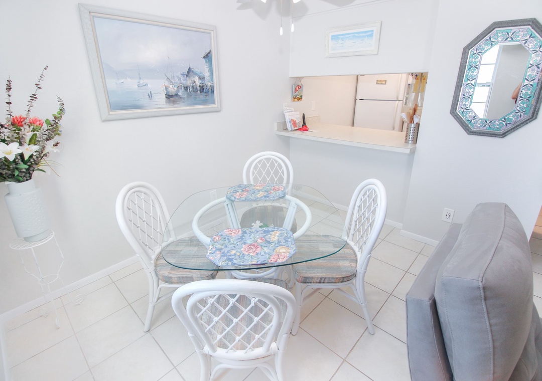 Serve your entrée and dine at the sight of the sea in the dining room. The dining area has a glass-top table lined with four chairs. With good food, your favorite people, and a gorgeous view, you'll treasure any time spent here.