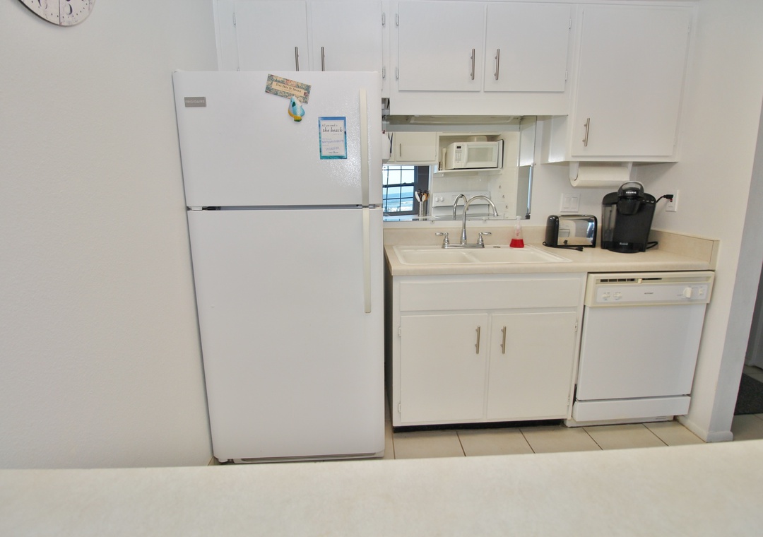 When dinnertime approaches, you won't have to venture far as the kitchen is equipped to make whatever meal you crave. White cabinetry and appliances make this space airy and enjoyable to cook in. You'll find the kitchen to be fully stocked with a Keurig, a drip coffee maker, a toaster, cooking utensils, pots and pans, and more.