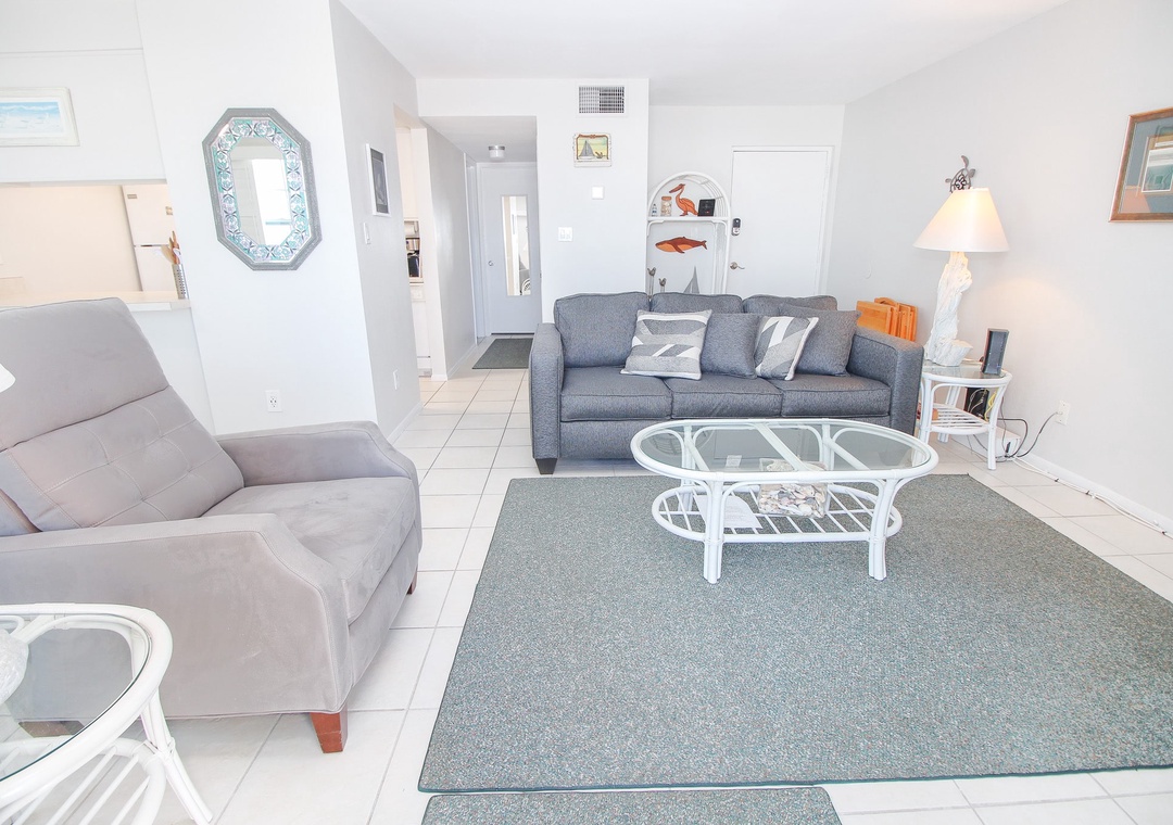 The condo greets guests with a grand impression as the crashing waves and golden shore are the first things you see upon walking in. Patterning after the colors just outside its door, the atmosphere is composed of soothing sea blues and white accents. The living area provides the perfect place to rest after a day of traveling. Two recliners and a queen pull-out couch look onto the flat-screen Roku TV equipped with cable and the dazzling view outdoors.