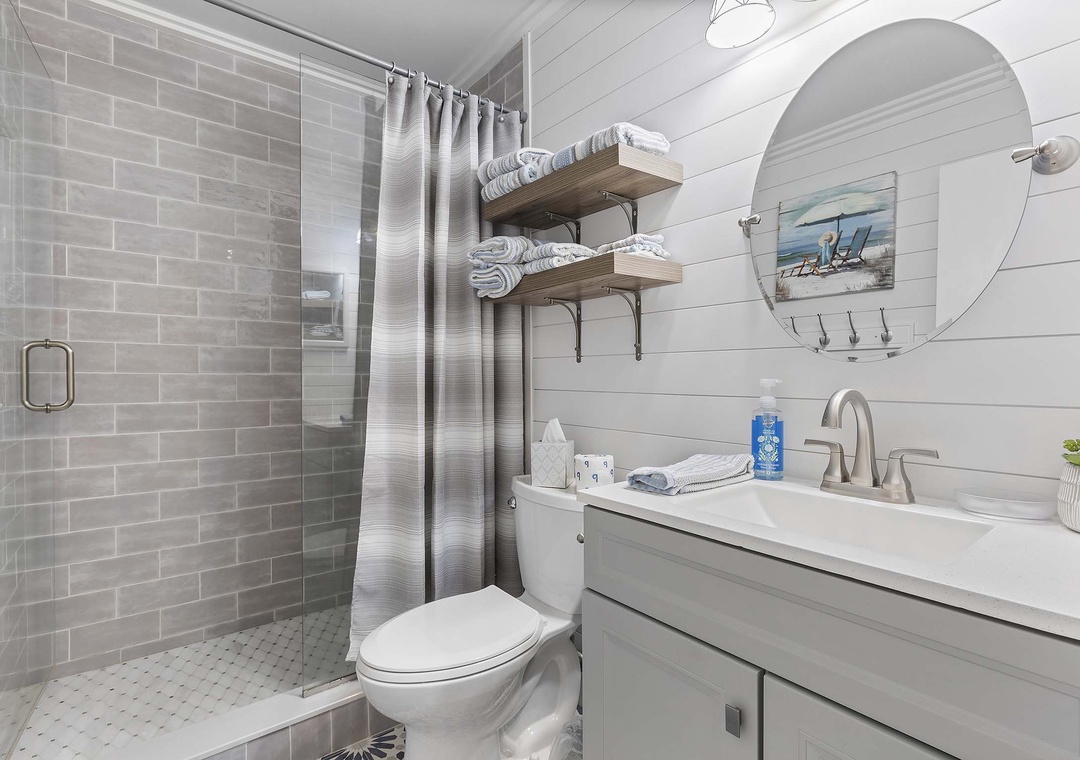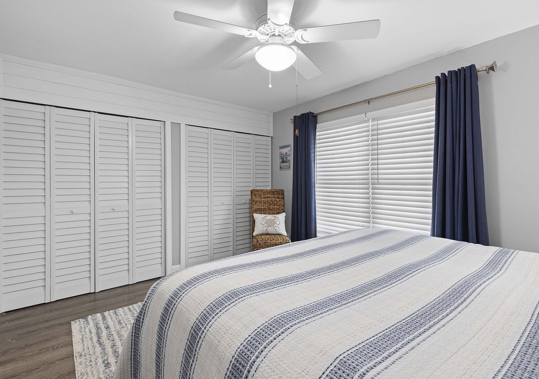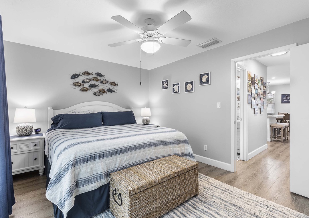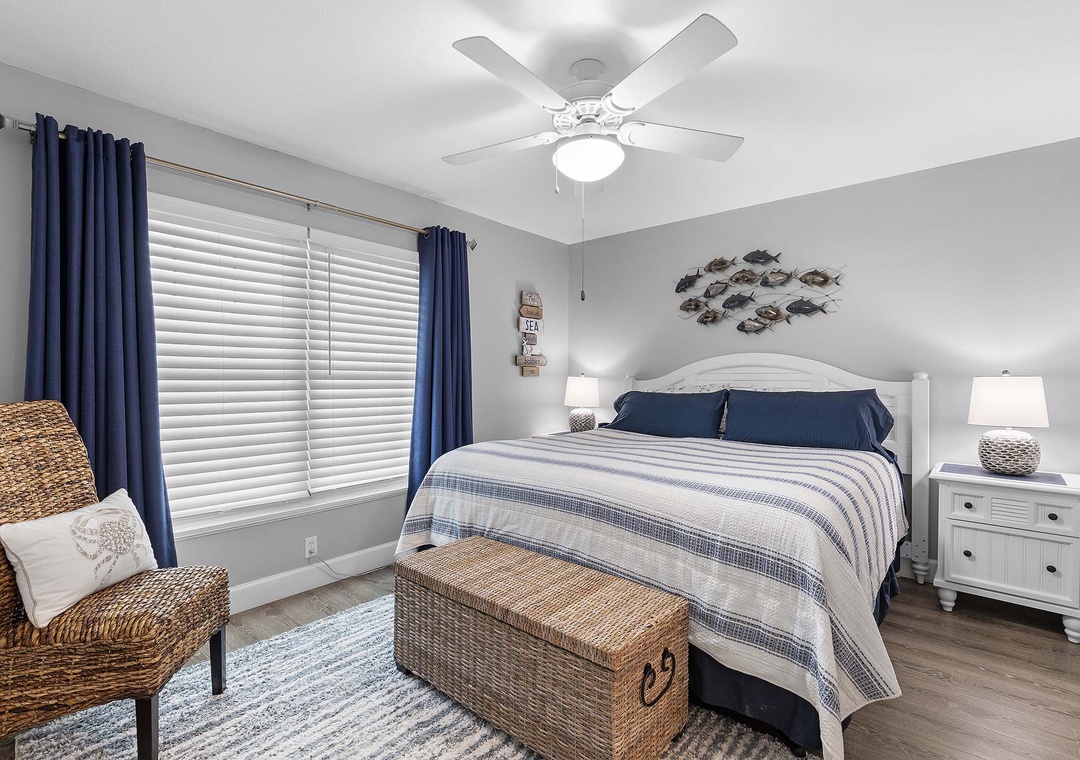 As nighttime approaches, you'll be more than ready to continue the R&R in the primary suite. Just like the rest of the condo, the bedroom is beautifully decorated in whites and blues. Wind down by reading in the plush arm chair and then curl up in the soft king bed for a good night's rest. Nearby is the condo's magazine-worthy bathroom. From a subway-tiled shower to shiplap walls, the bathroom is sure to elevate your nighttime and morning routine.