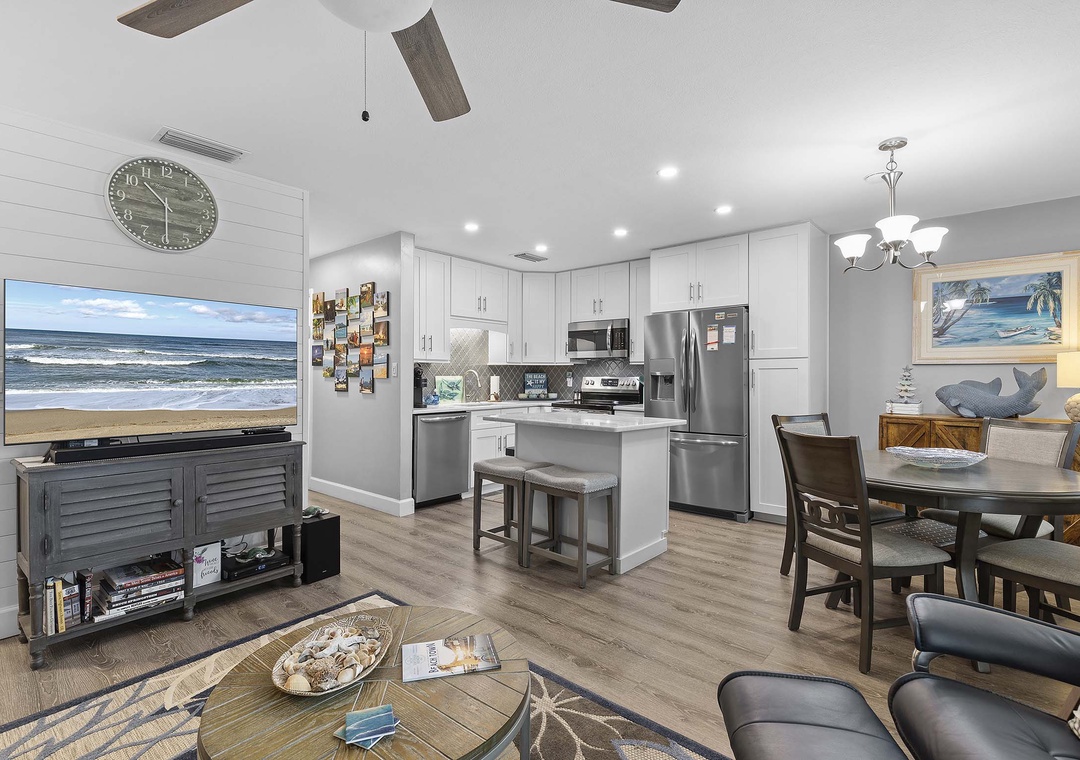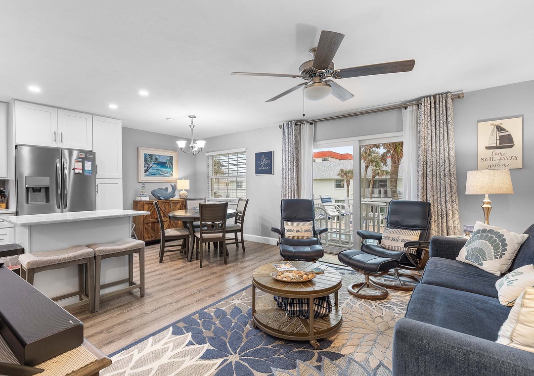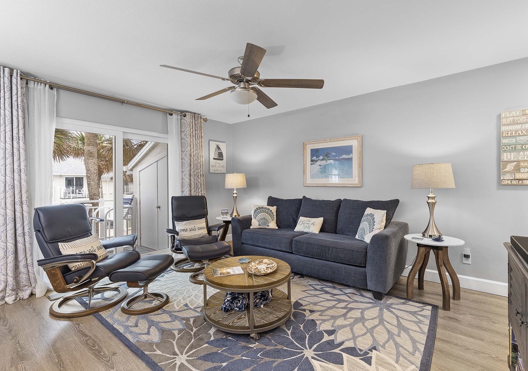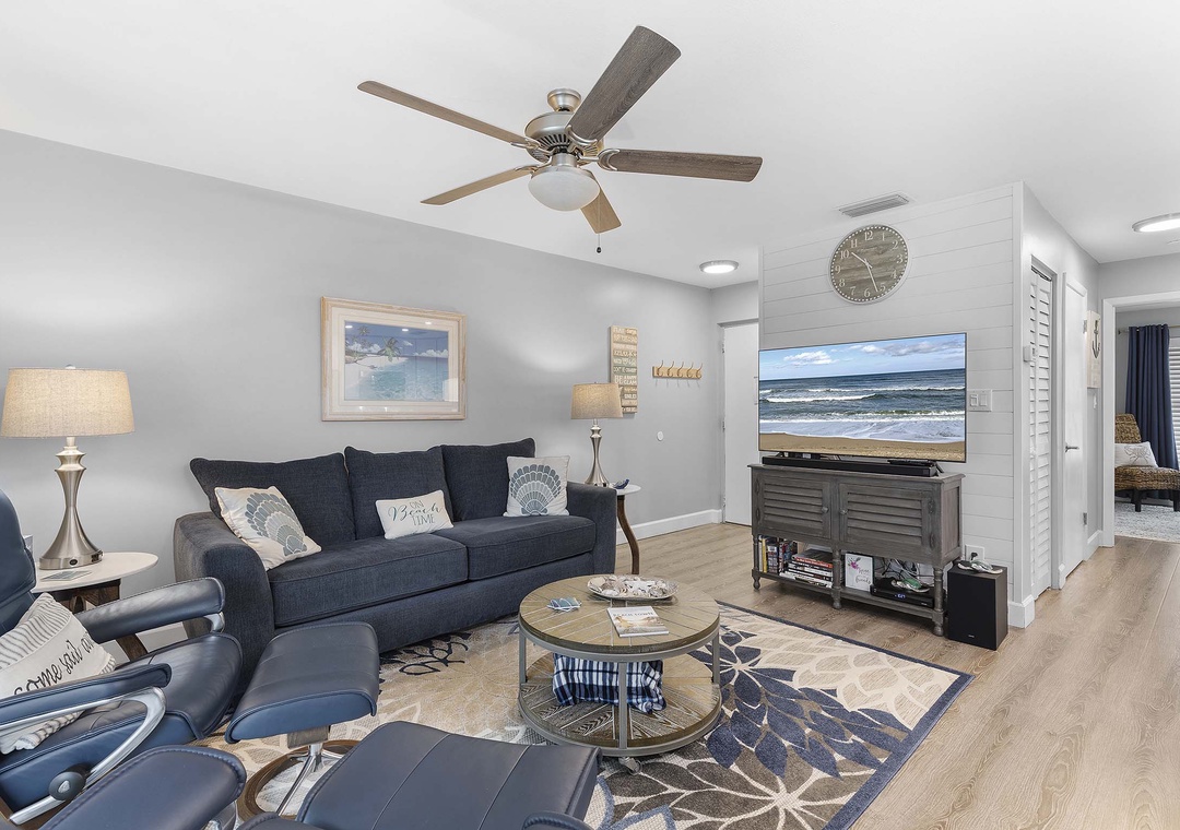 As you step inside, the second-floor condo greets with an impeccable first impression. Weathered wood-style flooring, light walls, and deep blue accents elude to the coastal outdoor atmosphere. The front door opens into a modern chic living area. Cozy up on either the pull-out couch or two armchairs and enjoy your favorite shows on the 55" Smart TV. Cable and streaming services are provided - just remember to bring your own log-ins!