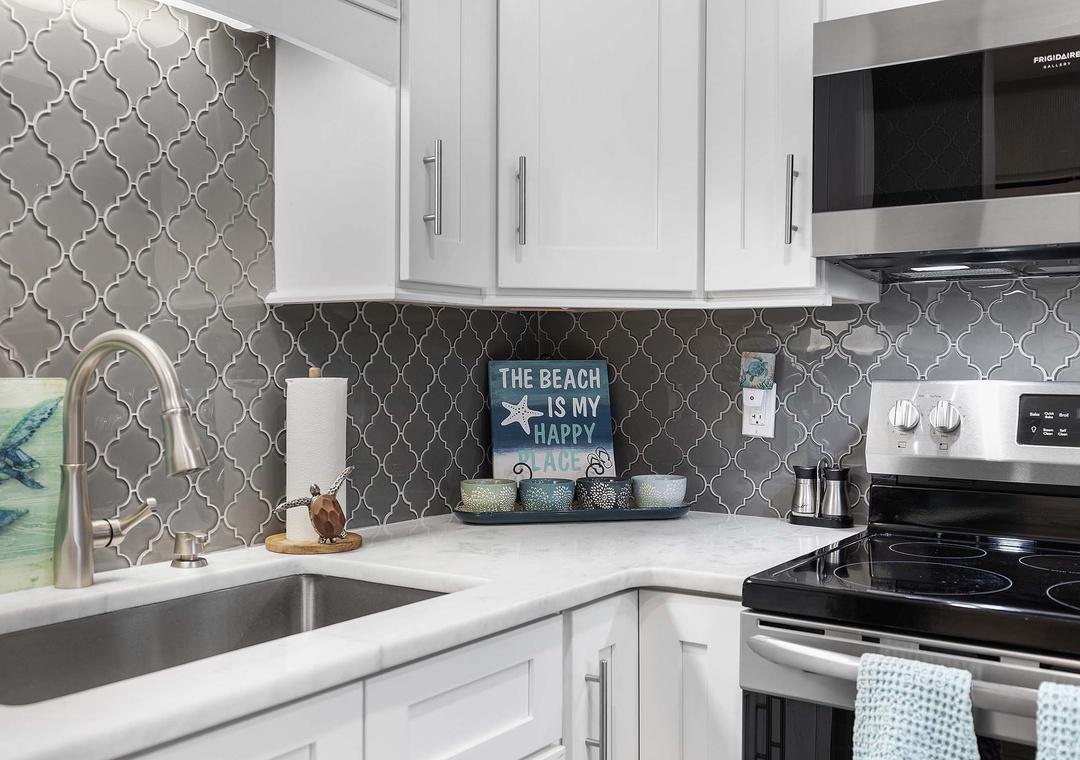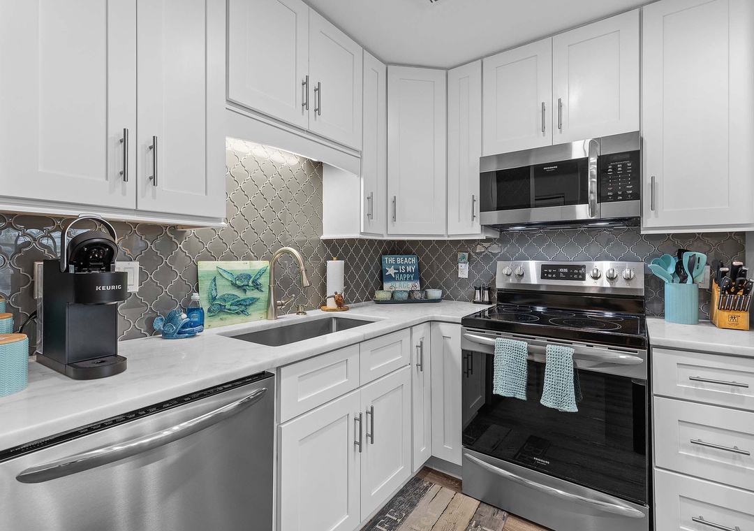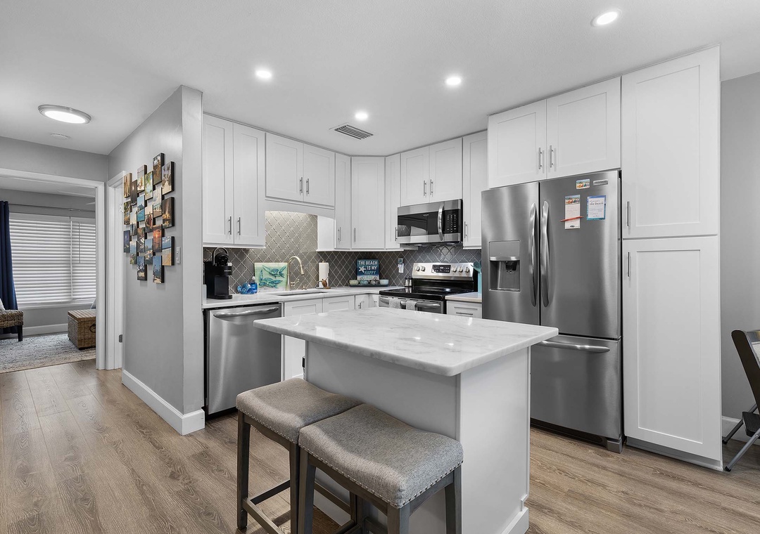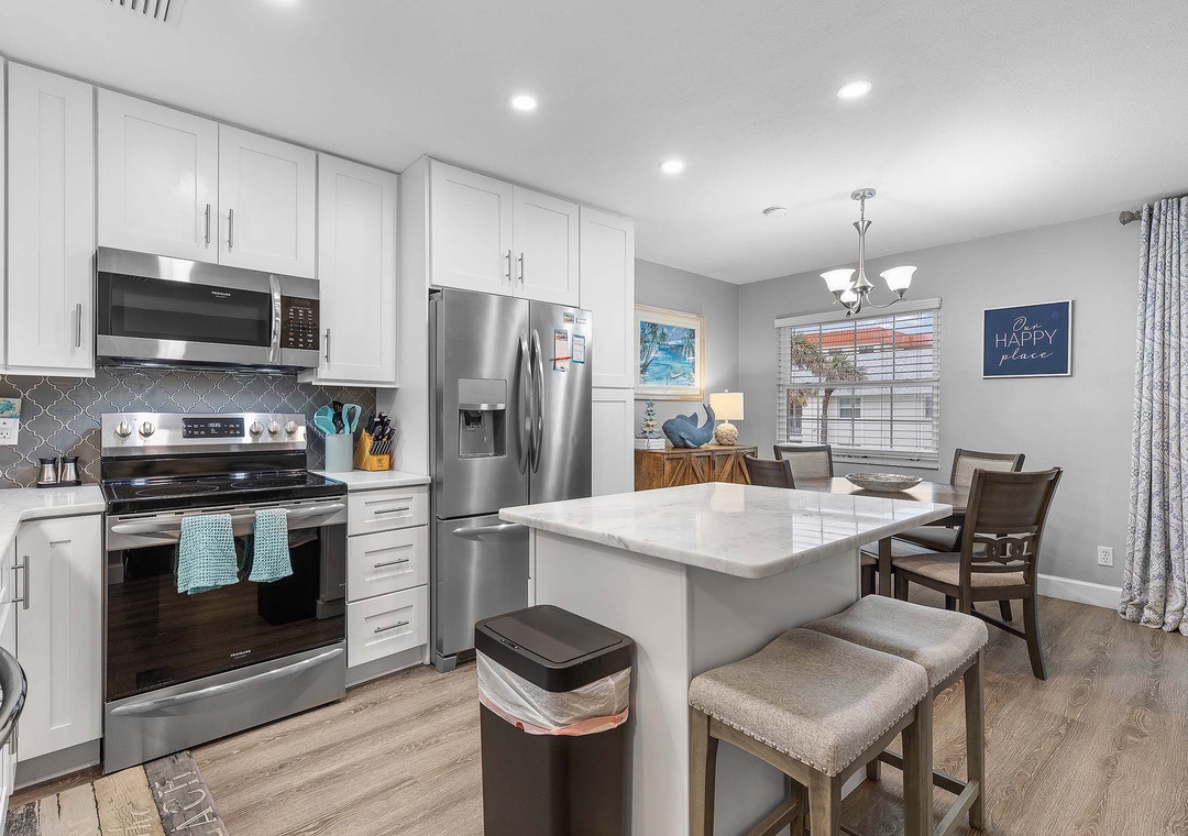 Before it's time to prep dinner, you'll find yourself drawn to the light and airy kitchen. White cabinets and countertops, stainless steel appliances, and arabesque backsplash give this space a luxury feel. Aside from its aesthetic appeal, the kitchen is well-stocked with a crockpot, drip coffee maker, blender, serving dishes and utensils, and more. Two dining options are provided as formal meals can be enjoyed around the dining table for four or at the kitchen island lined with two barstools.