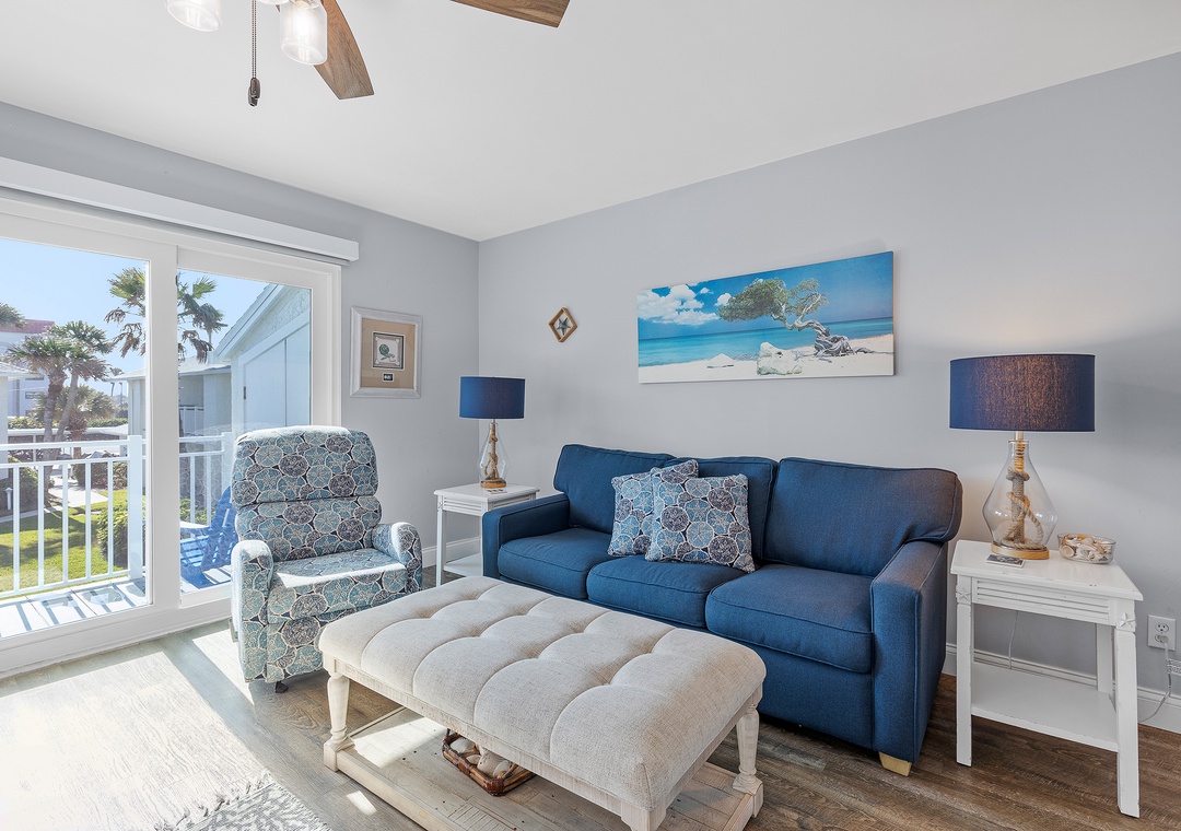 The condo starts its soul-soothing magic from the moment you walk through the door. Arrayed in subdued blue-grey hues and cream accents, you'll instantly feel your shoulders at ease from the airy atmosphere. As you step through the door, you'll find yourself in the chic, comfortable living room. Clock into vacation mode and rest from your travels on either the living room's pull-out couch or lovely patterned chair. Whether you turn on a show on the flat-screen TV (equipped with cable, DVD, and Blu-Ray players) or post your favorite beach pics using the condo's high-speed Wi-Fi, this space is one where you can kick back and relax.