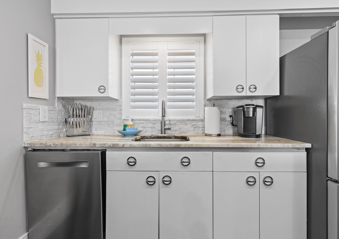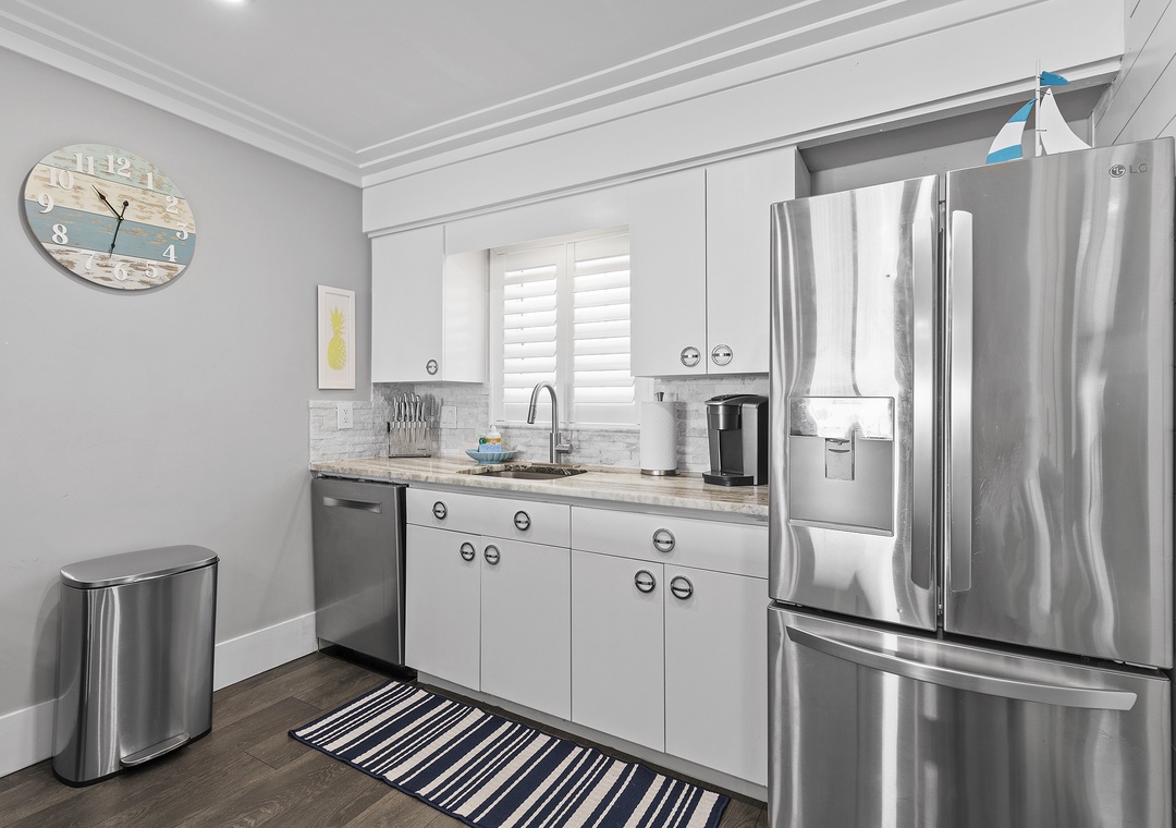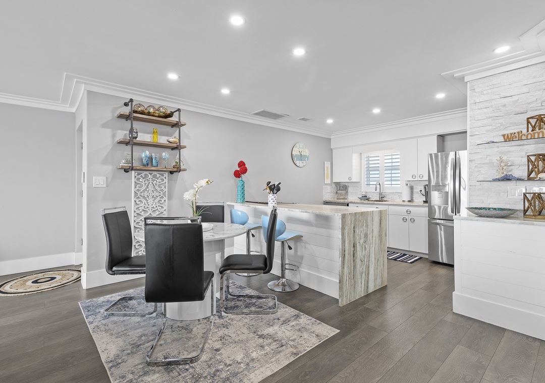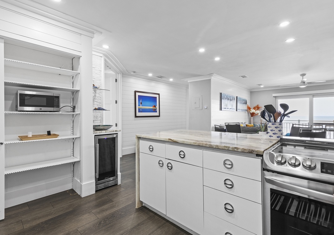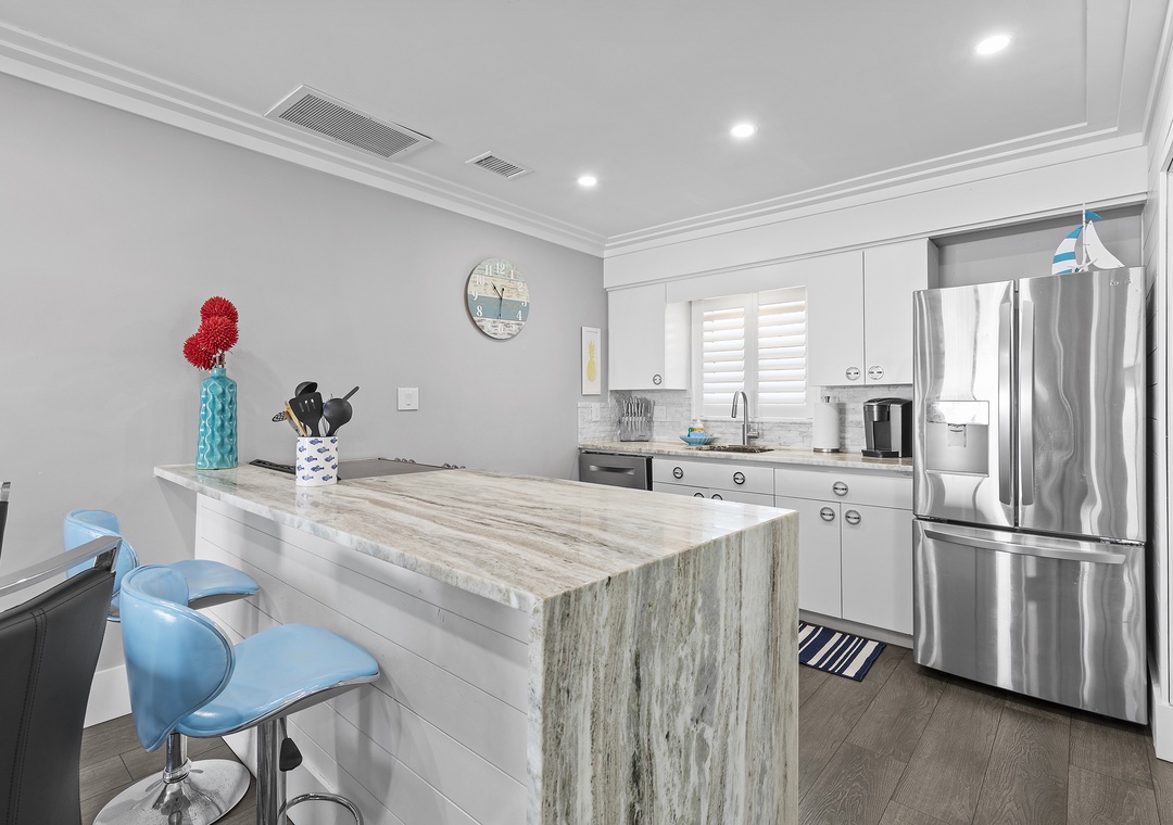 Kick off the beginning of your trip by mixing up margaritas in the updated kitchen. This space has a chic feel with its granite/marble countertops, stainless steel appliances, and white cabinetry. While New Smyrna Beach has amazing dining options, you'll hardly want to venture out when everything you could want is right here. Spend happy hour by the kitchen's mini bar that's equipped with glassware and a freestanding ice maker. If you're craving a few appetizers to go with your drinks, you can easily whip these up as the kitchen is fully-stocked with all the cooking essentials you should need.