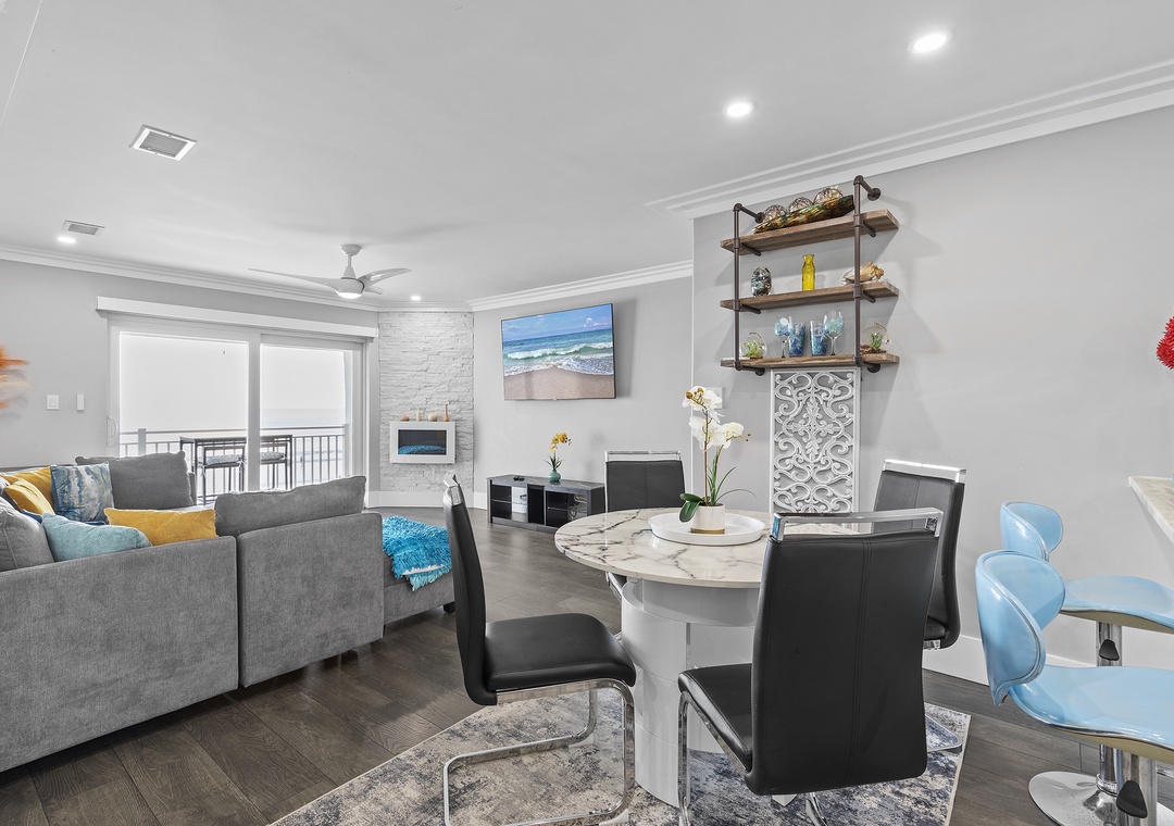 Bring your assortment of tapas to the dining room table for 4. The dining space exudes a mid-century vibe with its glass table and cushioned, Danish-style chairs. With delicious food before you, your favorite people gathered around, and the calming sight of the ocean, you'll find your favorite New Smyrna Beach memories were made here. Additional seating for two is provided at the kitchen's overhang.