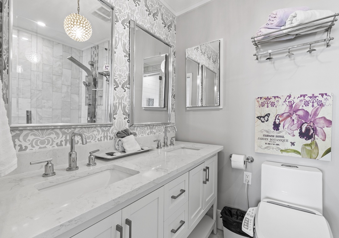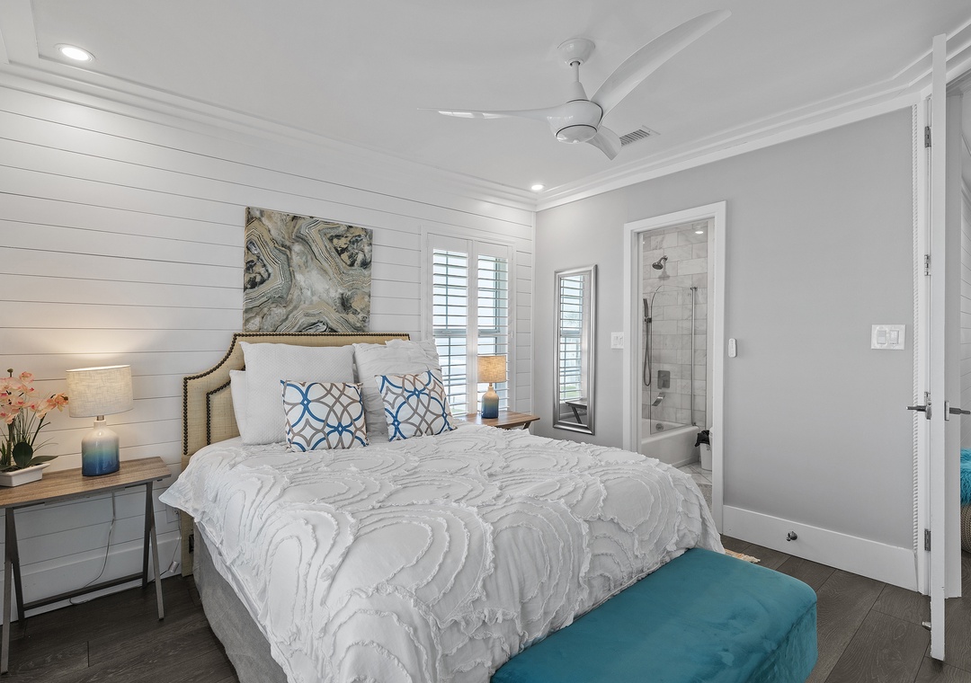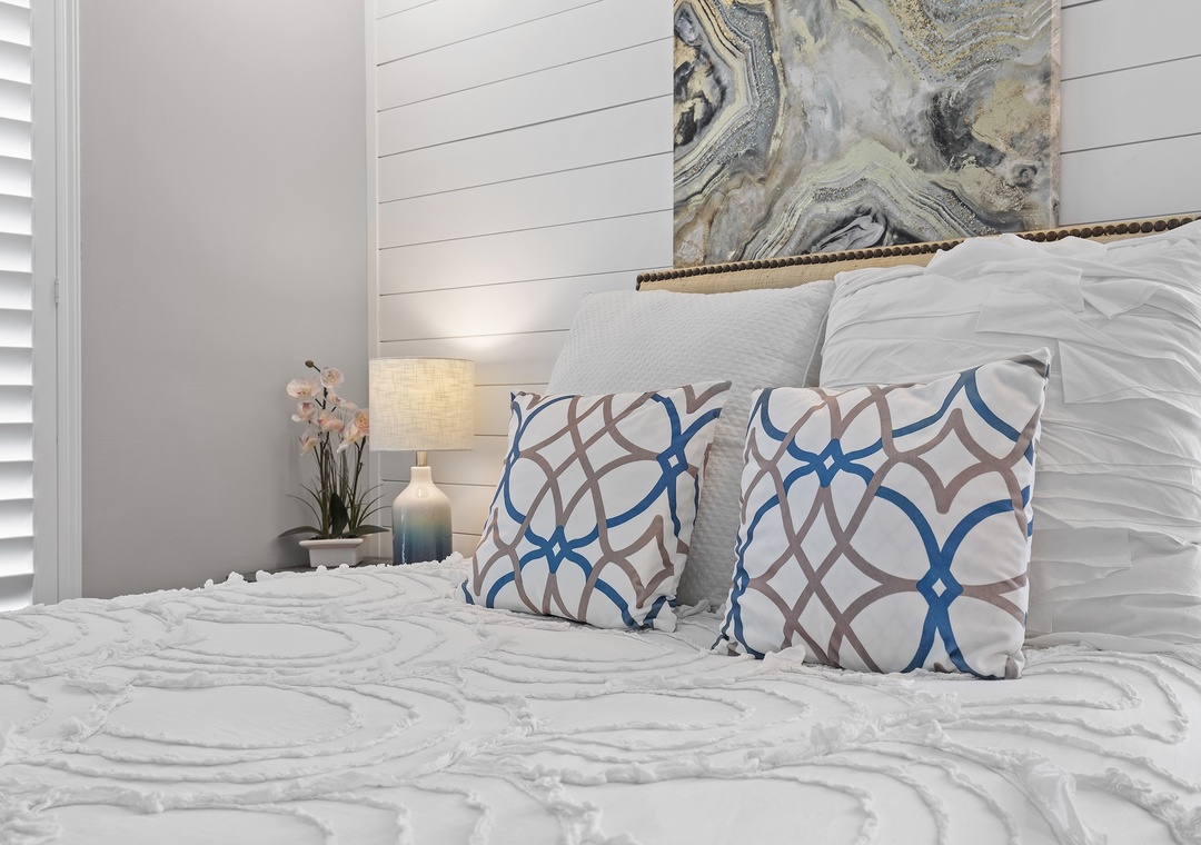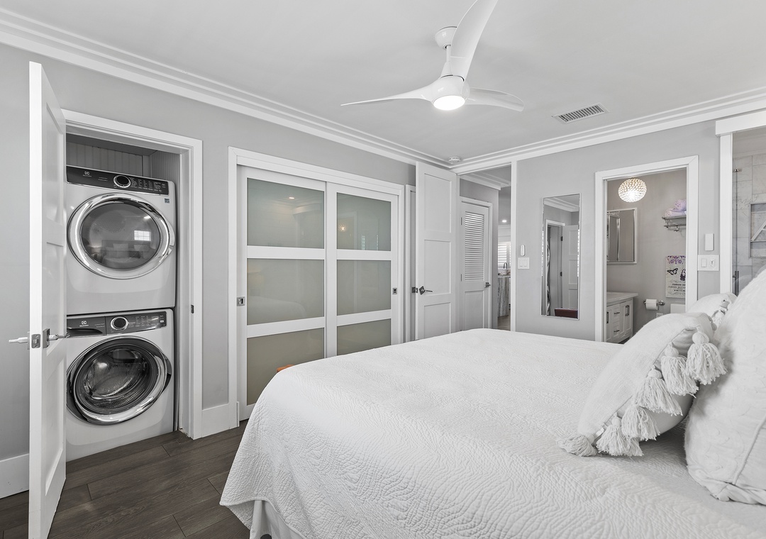 When you're ready for bed, you'll be delighted to retire to the primary suite. The primary bedroom holds all of the luxurious accommodations one could desire. From Hampton's style décor to a king-size Heavenly Bed by Westin to a dreamy window view of the sea, this bedroom was designed to pamper. While you can see the ocean sunrise from the plantation-shuttered window, there's no danger of being awoken too early by the sun as the master has black out shades. Located in one of the closets, you'll find a full-sized, stacked washer and dryer provided. The primary bathroom is equally as stylish as it has a double vanity, bidet toilet, and a gorgeous walk-in shower with wall jets and a glass panel that shares the bedroom's ocean view.