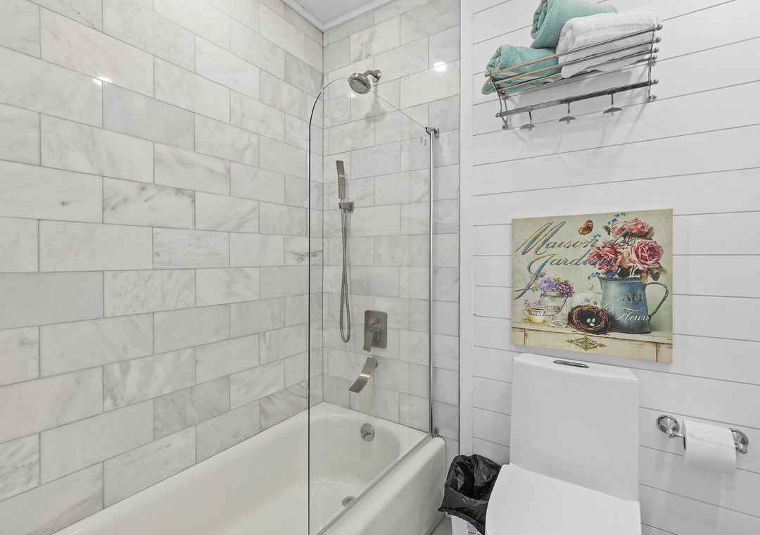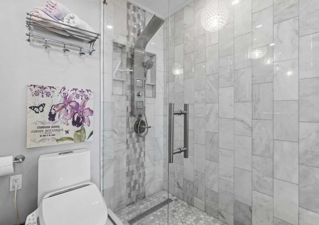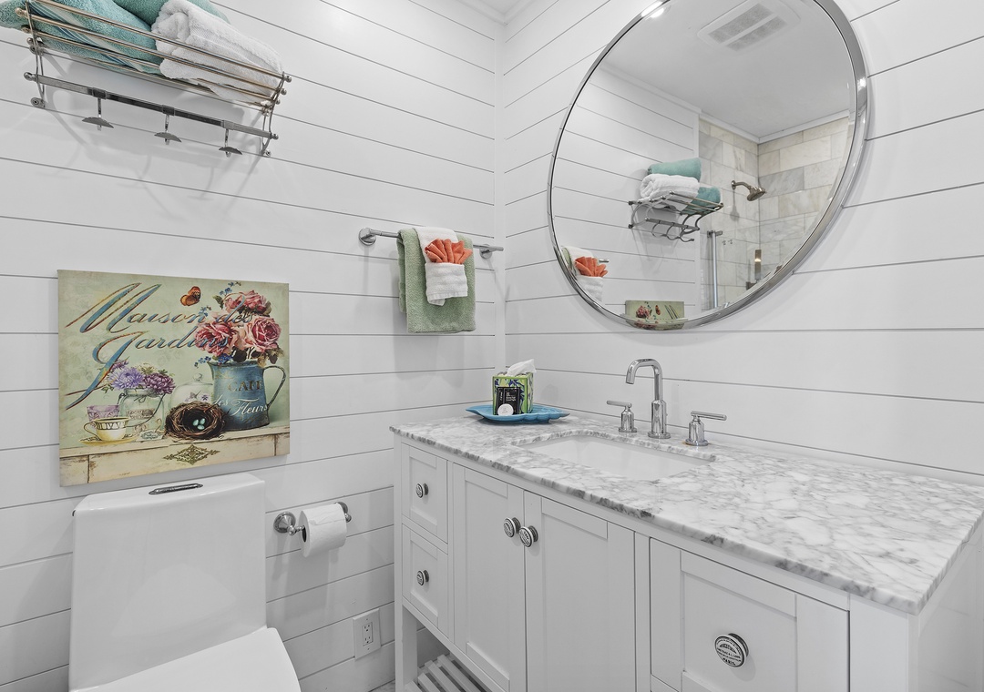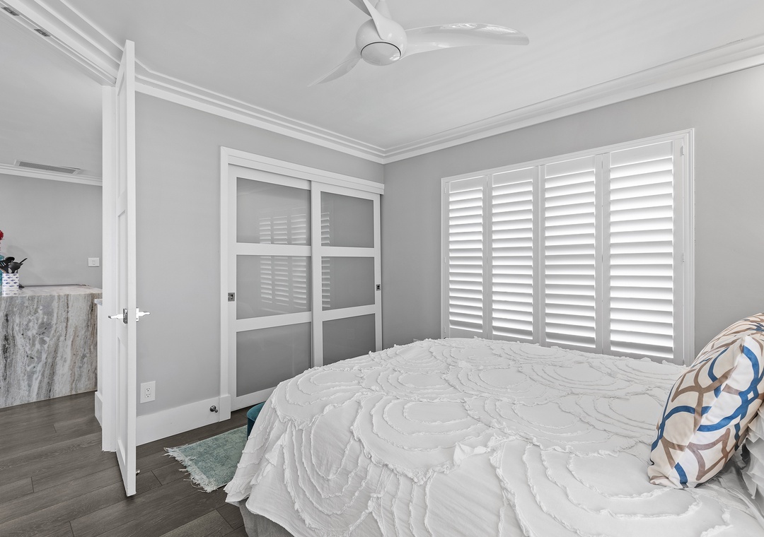 When you're ready for bed, you'll be delighted to retire to the primary suite. The primary bedroom holds all of the luxurious accommodations one could desire. From Hampton's style décor to a king-size Heavenly Bed by Westin to a dreamy window view of the sea, this bedroom was designed to pamper. While you can see the ocean sunrise from the plantation-shuttered window, there's no danger of being awoken too early by the sun as the master has black out shades. Located in one of the closets, you'll find a full-sized, stacked washer and dryer provided. The primary bathroom is equally as stylish as it has a double vanity, bidet toilet, and a gorgeous walk-in shower with wall jets and a glass panel that shares the bedroom's ocean view.