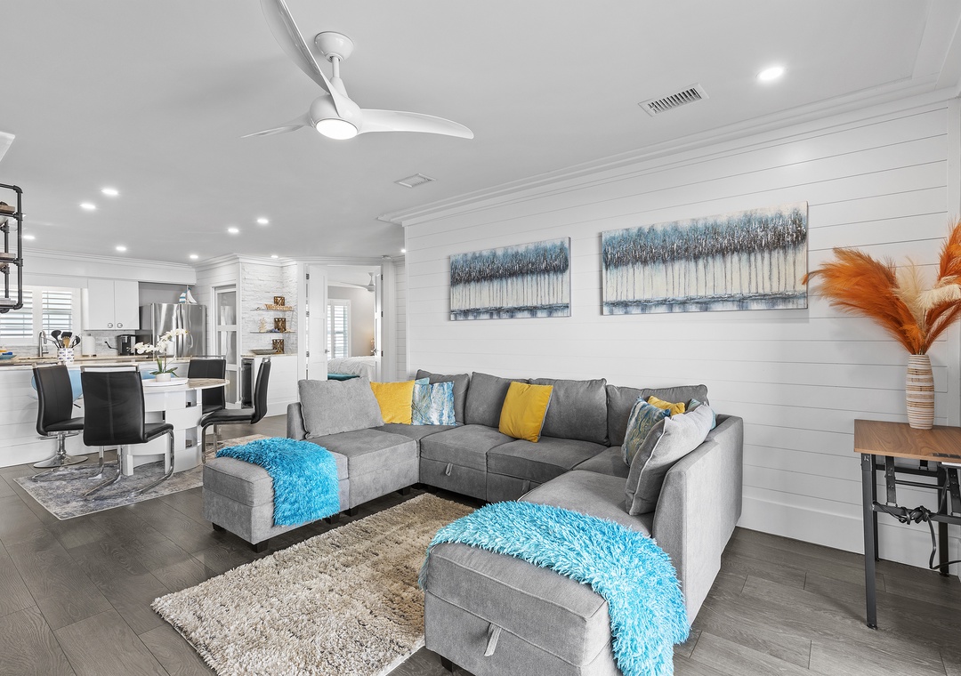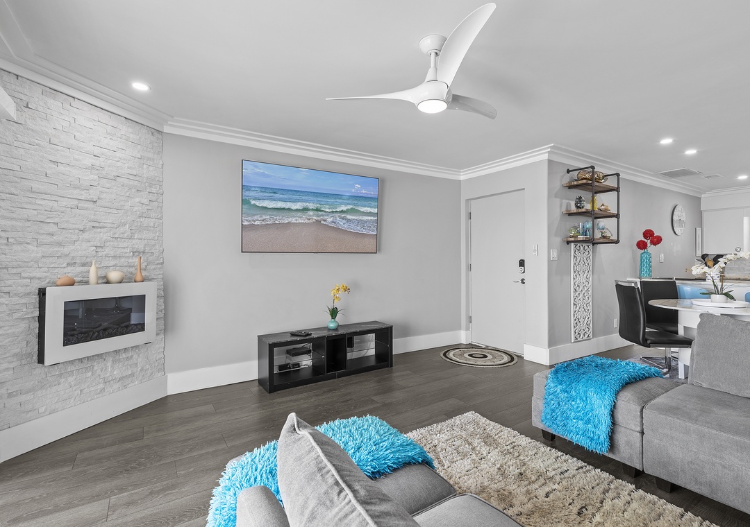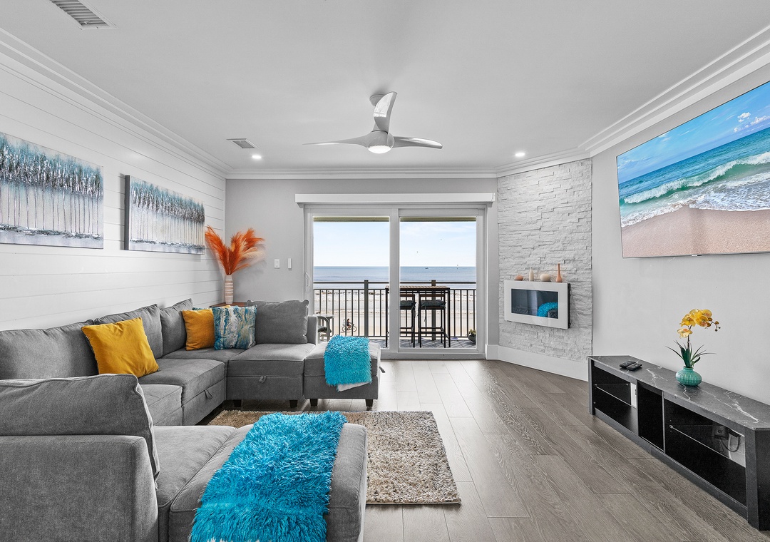 When you're ready for an afternoon siesta after a day on the shore, you'll gravitate to the spacious living room for rest. The living area holds a plush, chaise sectional, two mid-century chairs, and a dreamy, airy feel. Once you've chosen your comfy spot, play your favorite shows on the mounted, 65-70" Smart TV. Cable, DVR, a DVD player, and even streaming services are provided (just remember to bring your log-ins!). From the LED fire place to binge-worthy shows on the TV, this space has all the cozy comforts of home.